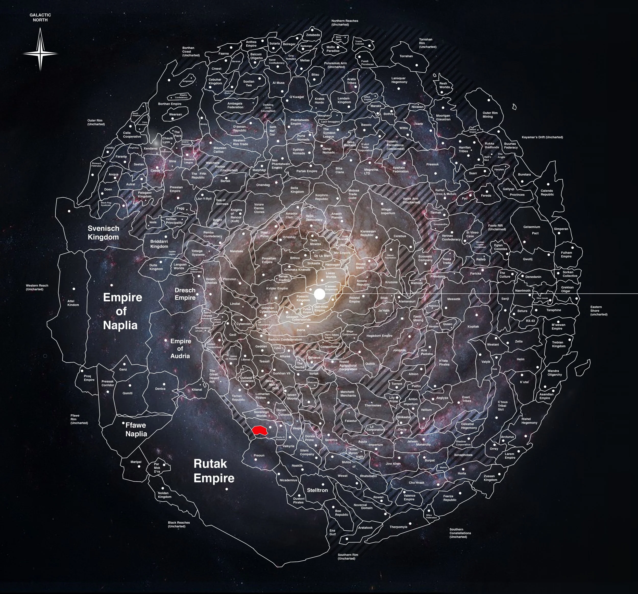 The Lost Worlds, officially known as the Republic of Lost Worlds Constellations, was a stellar empire situated in the Terran Southern Arm of Orion. This region included the Lost Light Nebulas, the main Lost Worlds constellations, and numerous smaller constellations, with Gariue as its capital system. With over 11 quadrillion inhabitants, it was one of the most populous regions, characterized by its multiethnic and multicultural population. Initially colonized by the Terran Empire, it gained independence after the First Consular War but remained politically fragile. This instability eventually gave rise to autocratic regimes and separatist movements, which defined much of its history.
